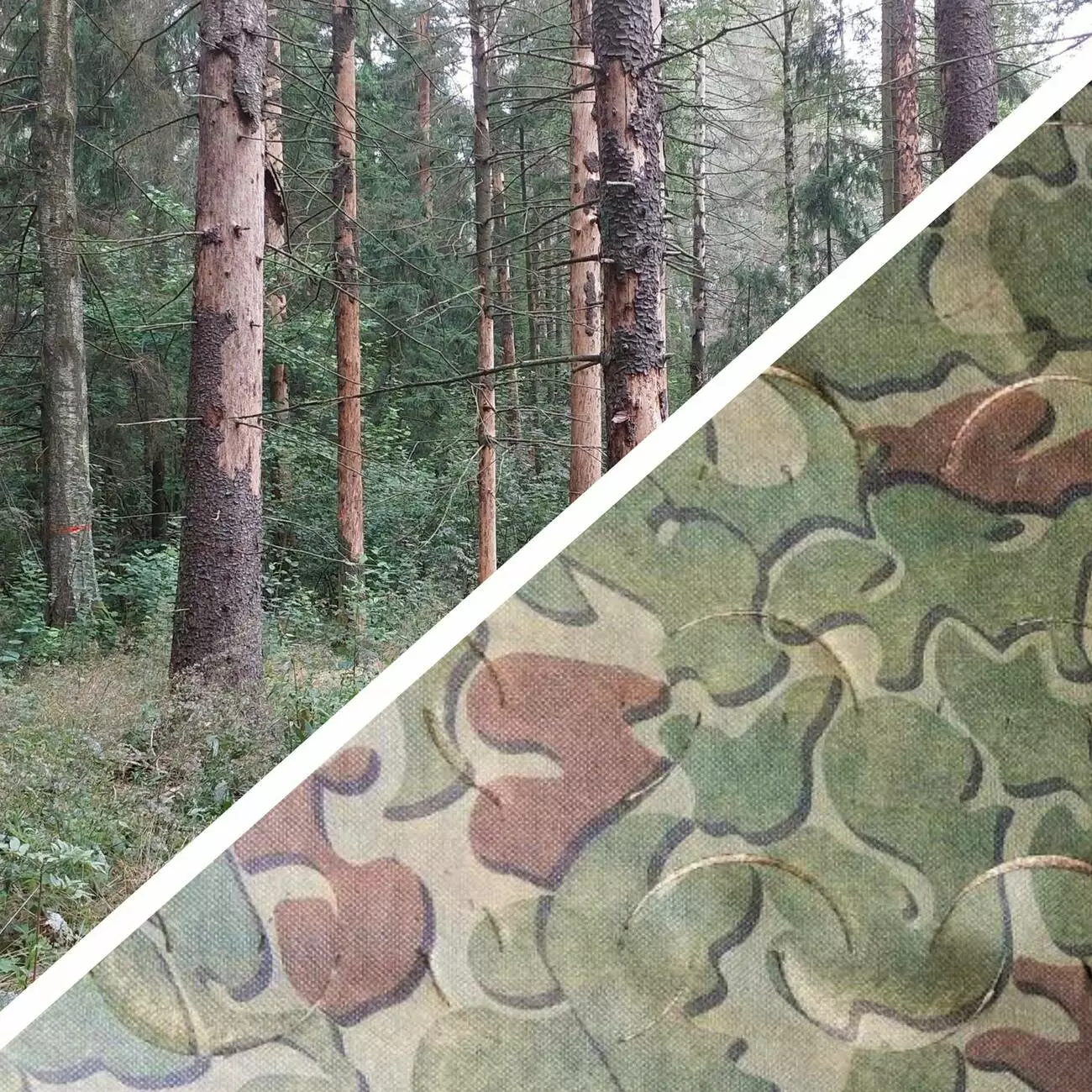 - Тип маскування: Під зелень, листя, сосновий ліс; весна, літо, рання осінь