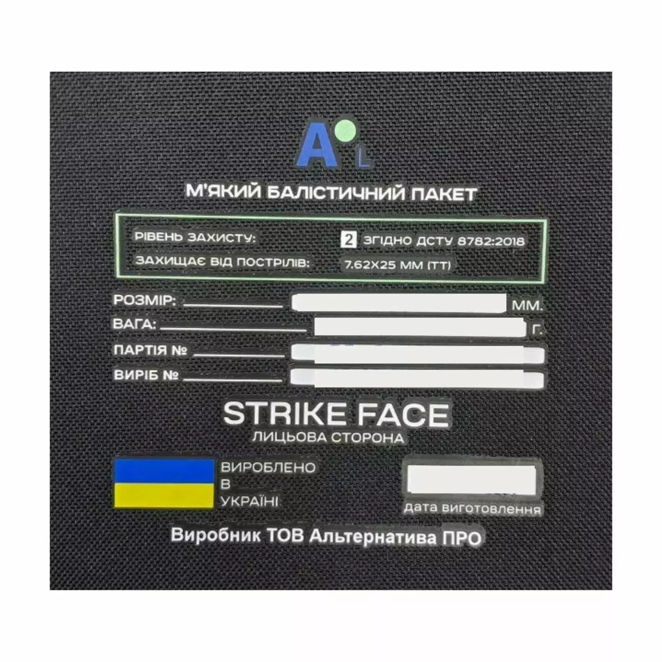 - Матеріал балістичного пакету: НВМПЕ + арамідне волокно (кевлар)