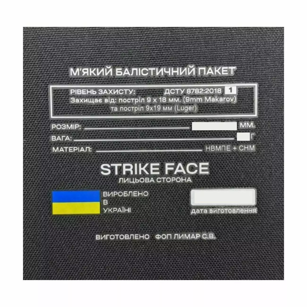 - Матеріал балістичного пакету: НВМПЕ + арамідне волокно (кевлар)